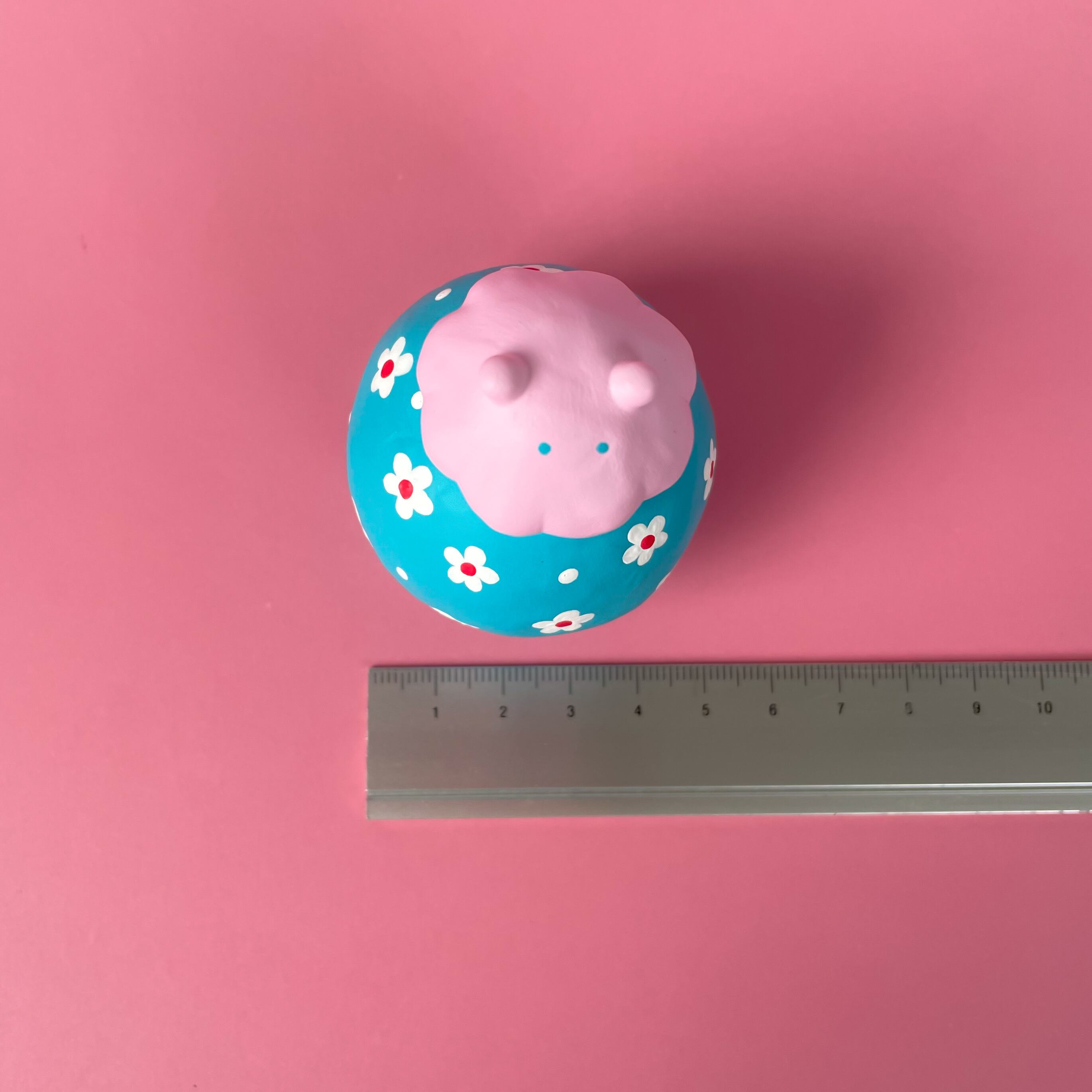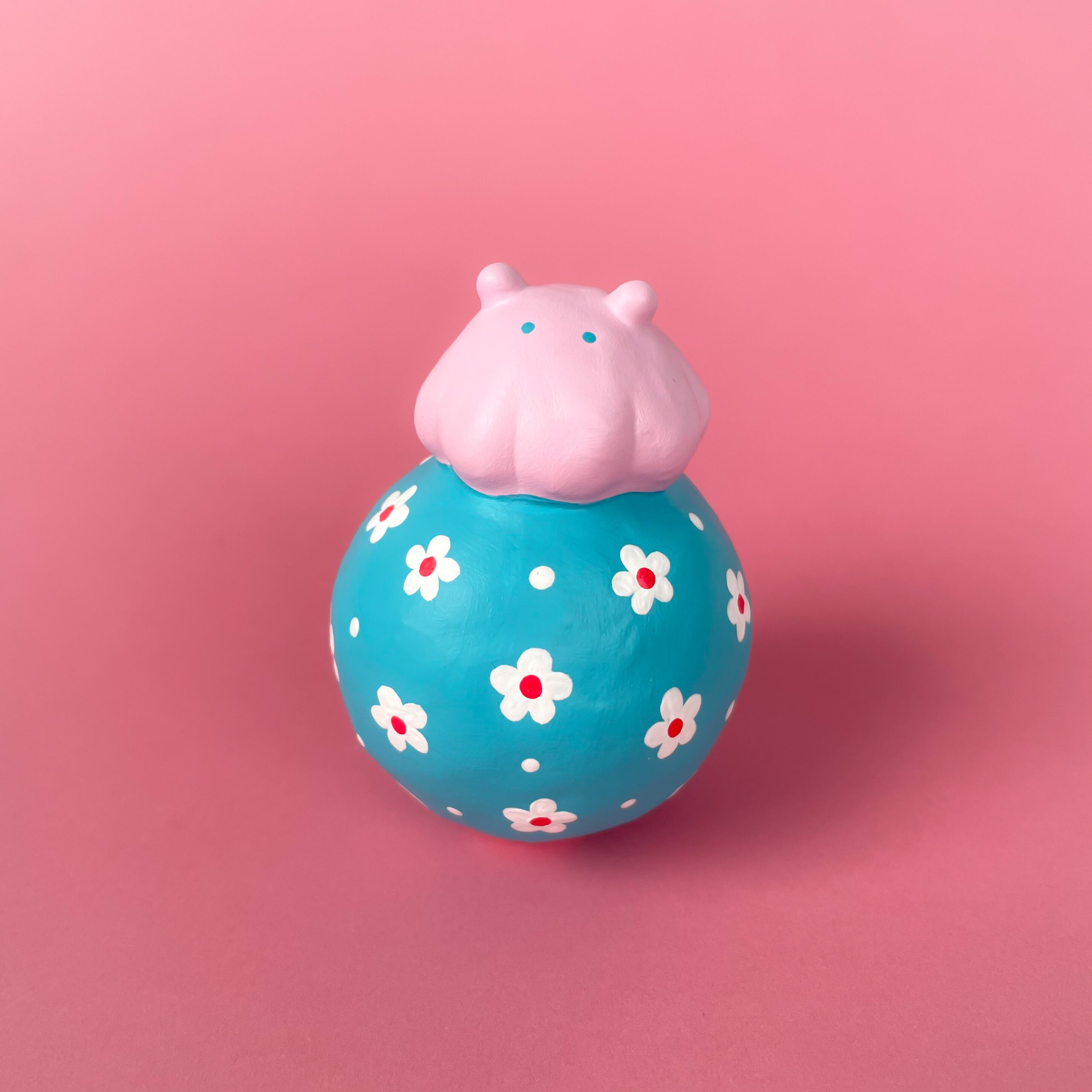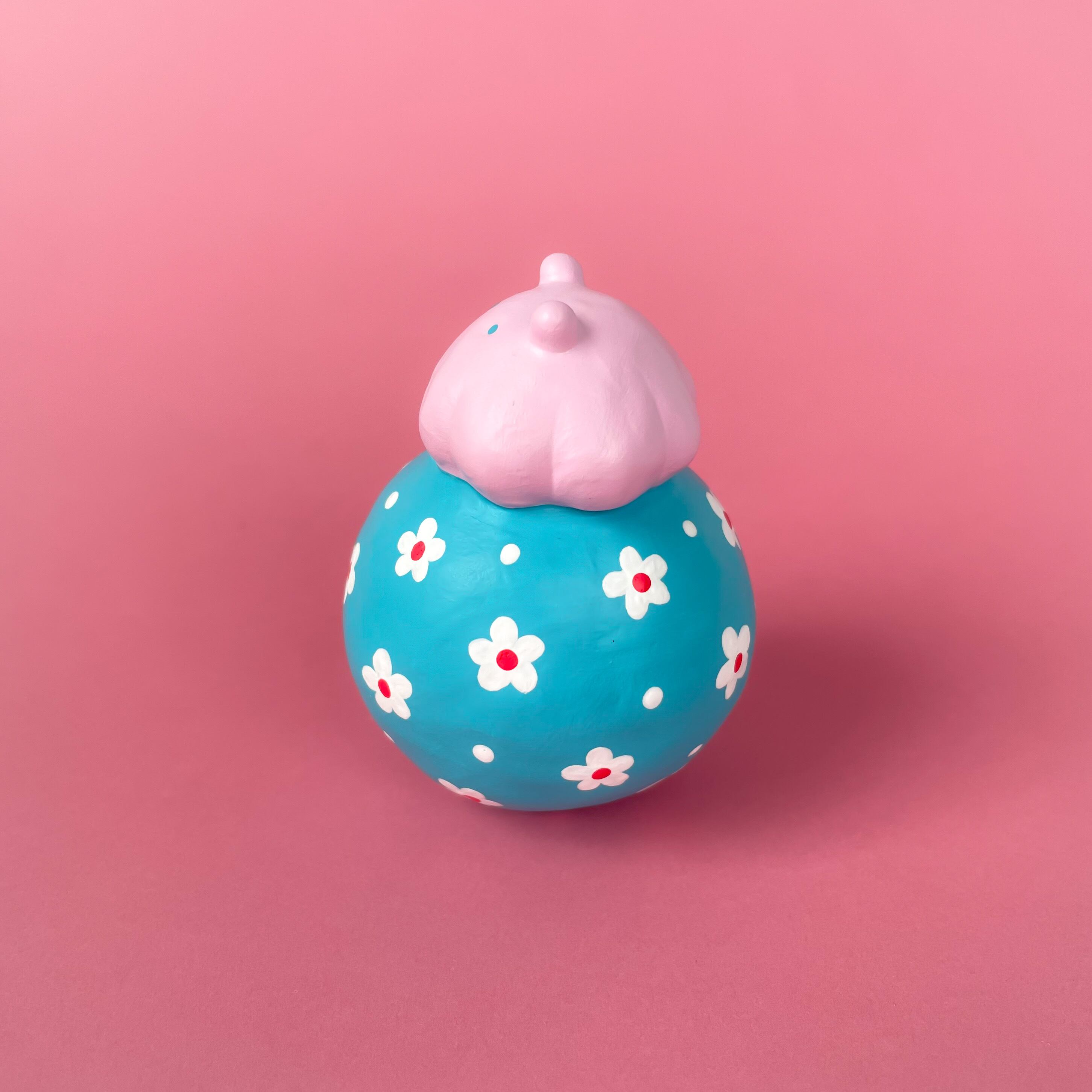 花柄のボールに乗ってバランスを取っている起き上がりメンダコです。つつくとゆらゆら揺れてバランスを取ります。たまに失敗して斜めになったりもしますが、そこも含めてお楽しみいただければ幸いです。