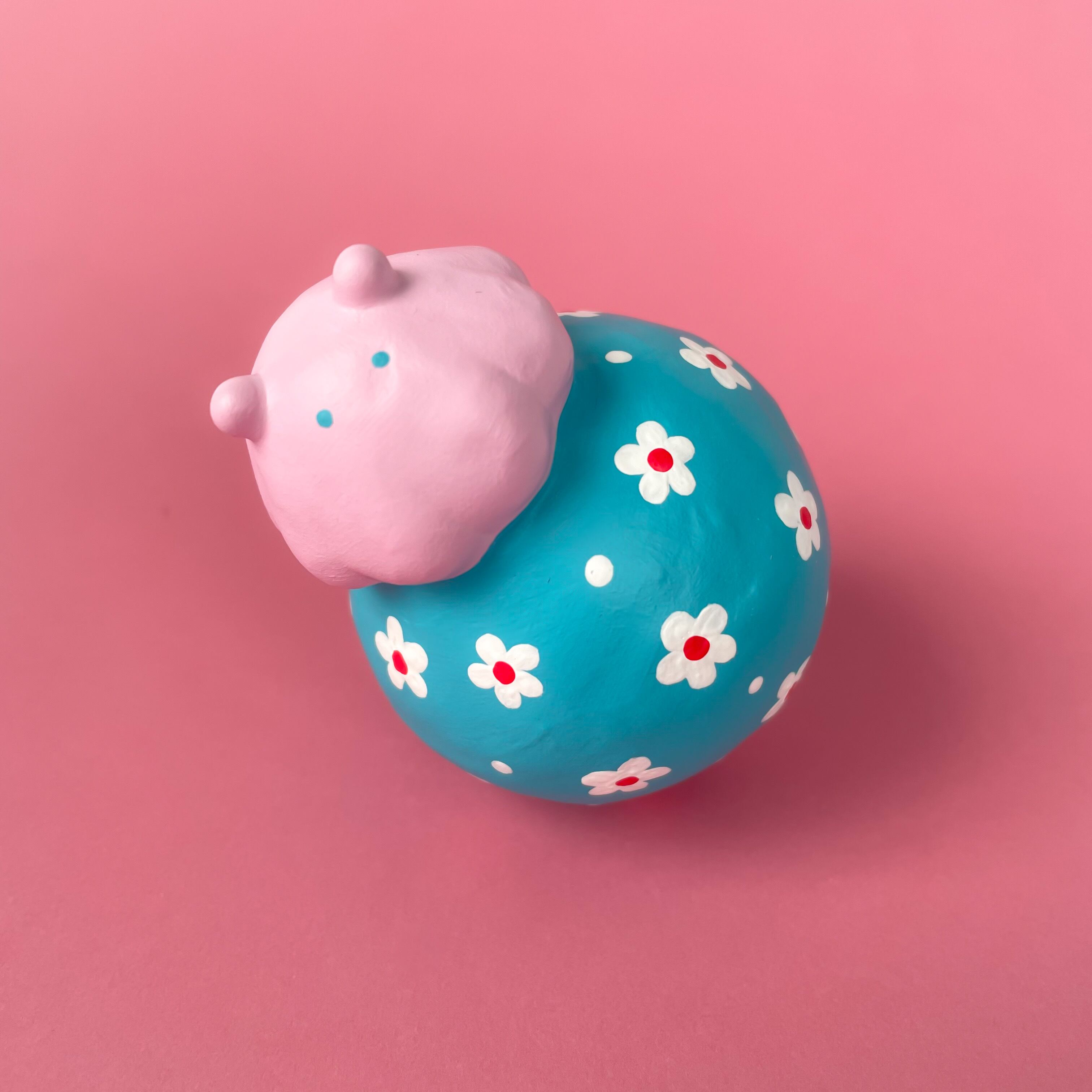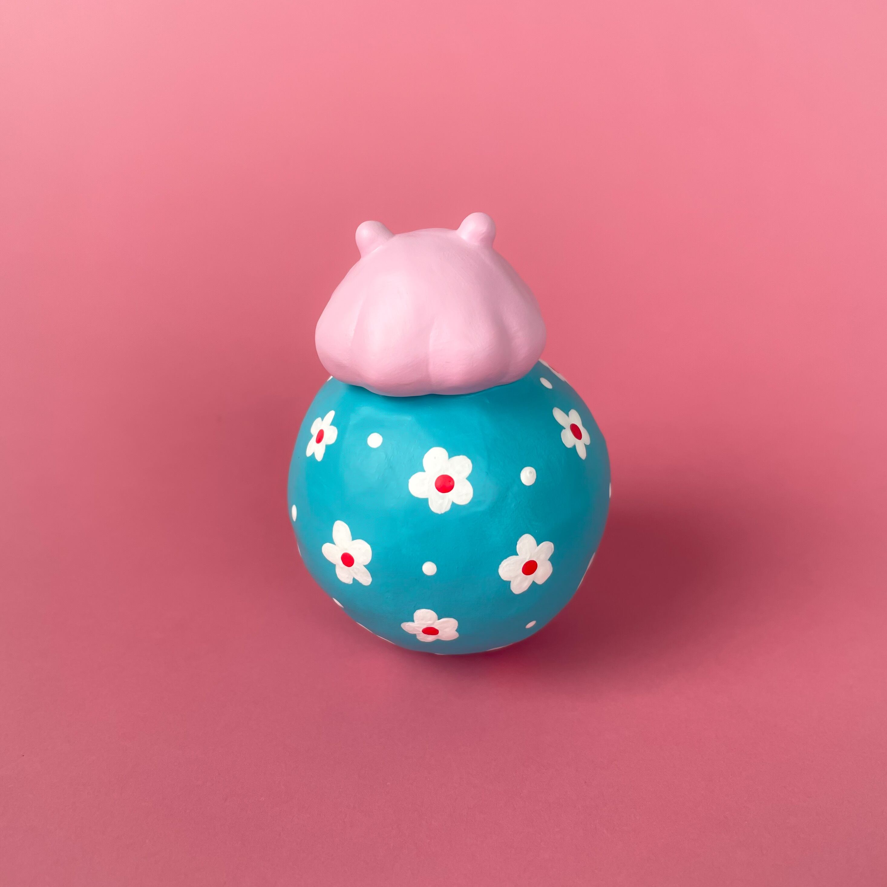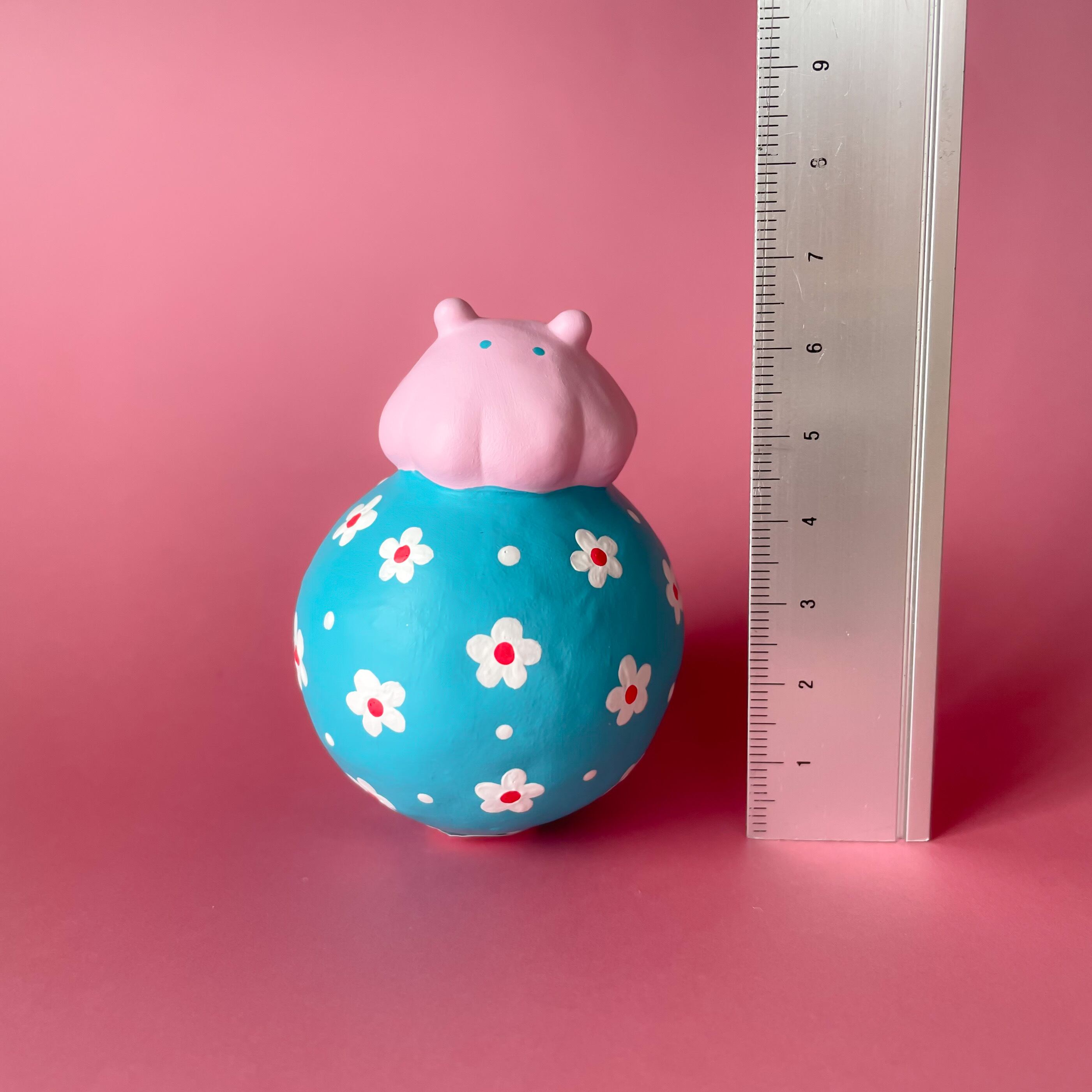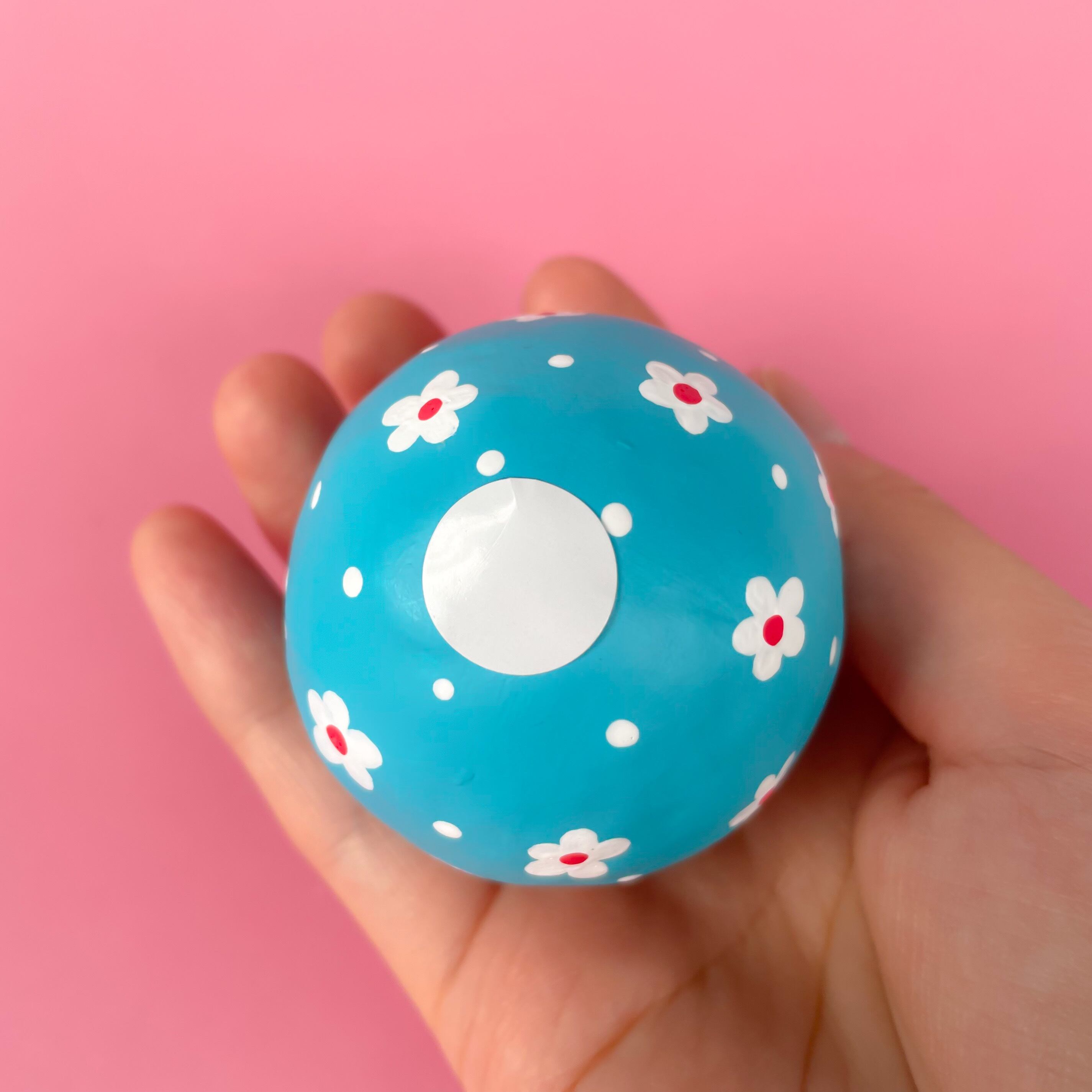 花柄のボールに乗ってバランスを取っている起き上がりメンダコです。つつくとゆらゆら揺れてバランスを取ります。たまに失敗して斜めになったりもしますが、そこも含めてお楽しみいただければ幸いです。